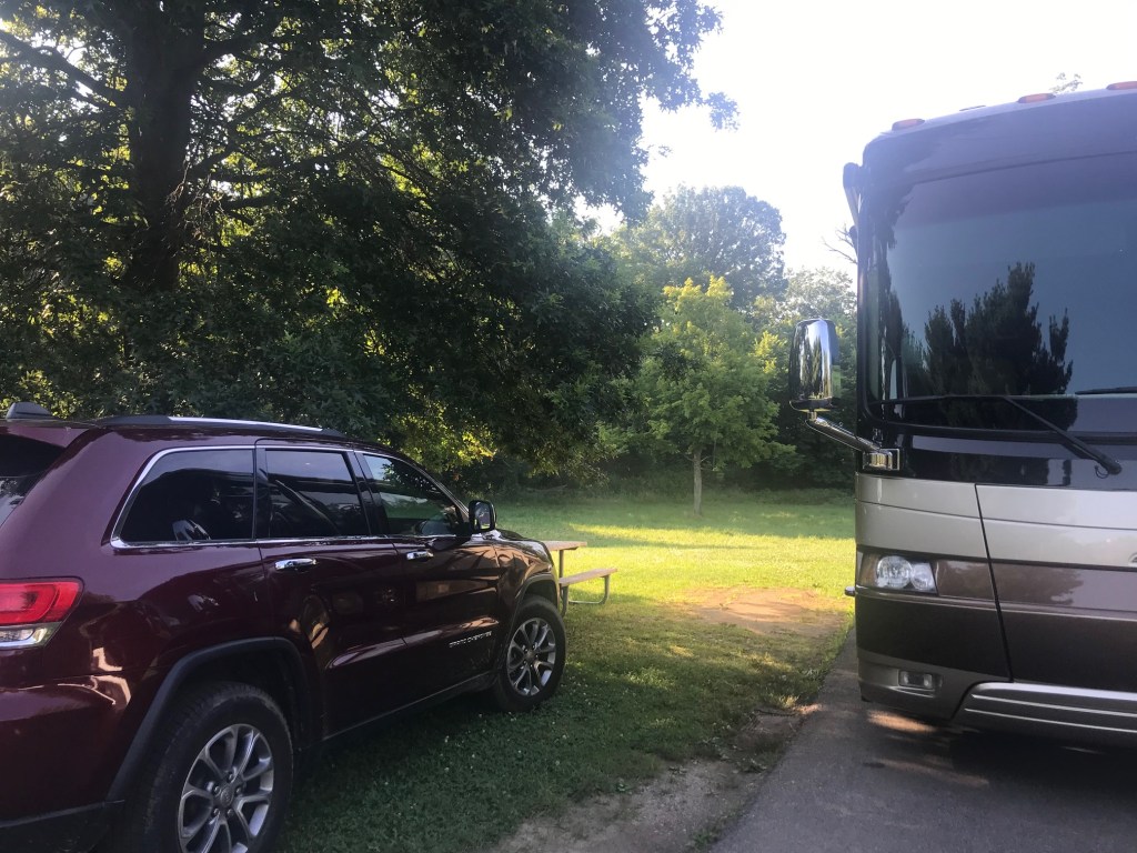 We headed back to Contessa and spent another delightful evening by the firepit overlooking the small lake that was the centerpiece of this delightful campground. Purchased about two years ago, Gary and Mable are working hard to get it back into shape after having been closed, neglected and abused for 15+ years. The roads have all been resurfaced, the internet was to be active by the day we were to leave and the new pool is to be ready by fall. The sites closest to the lake, however, presented a few challenges with spacing and not sufficiently level for a coach of our size.