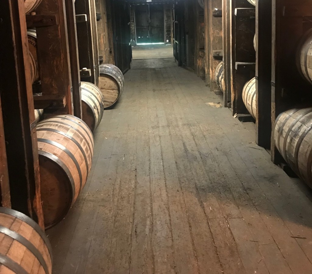 The barrels on the gravity rail on the right were produced the night before and are headed to a rickhouse