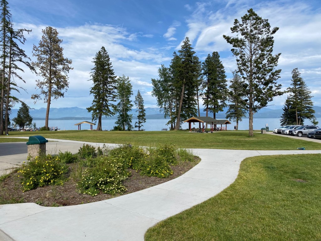 We continued south to return to Lakeside, where Contessa waited for us. Edgewater RV Park & Cabins was directly across from the City Marina and Volunteer Park. We had a lovely stroll along the shore of Flathead Lake.