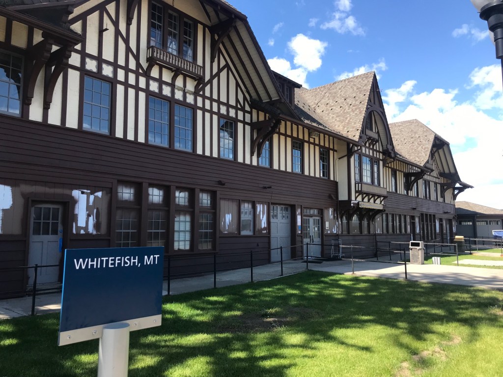 The next day (Wednesday) we explored Whitefish, Kalispell and Lakeside. Whitefish was a division point for the Great Northern Railway from its founding in 1904 until 1955. It served as a hub for both passenger and freight transportation. The two story tudor-style building, designed by railroad architect Thomas McMahon, housed the railway’s division office on the second floor, while the first floor hdlc the yard office, freight and baggage rooms, ticket office, general waiting room and telegraph office. It also had a men’s smoking room and a ladies’ rest room.