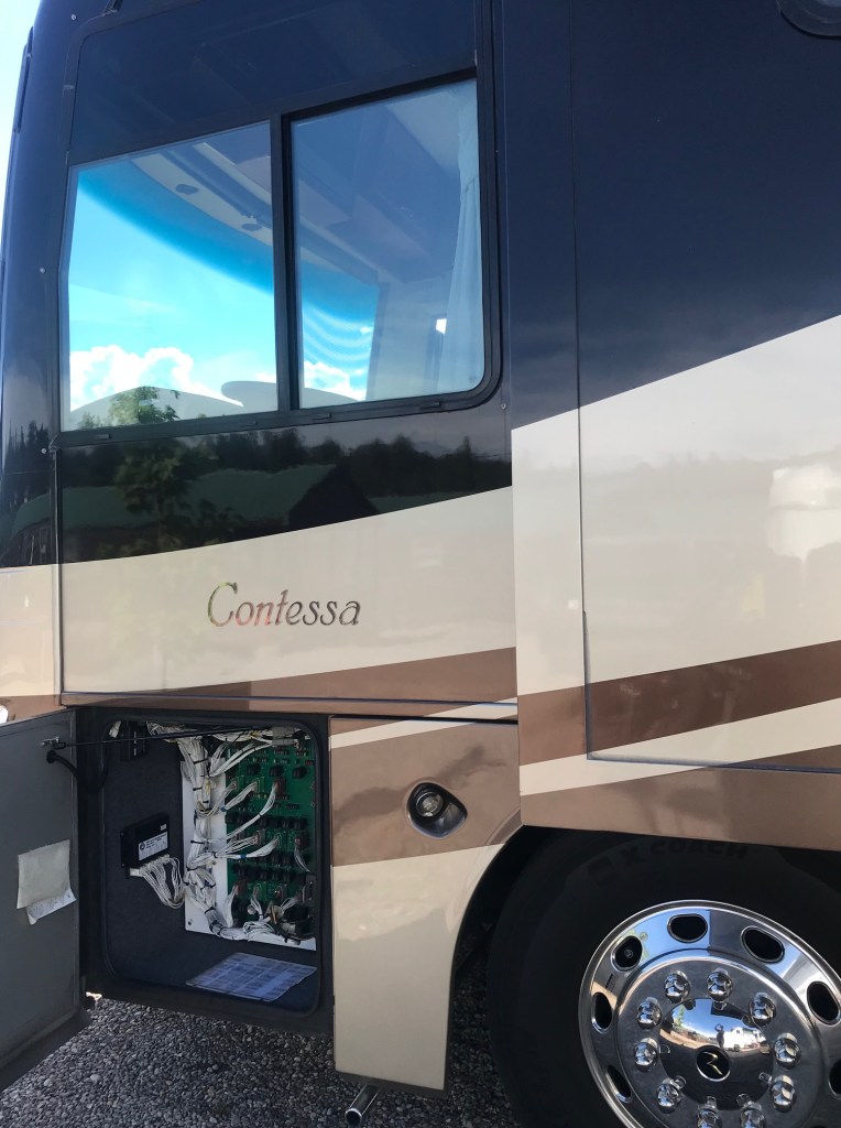 As part of the diagnostics, we turned the ignition on and closed the entry door – which locked the door! So, there we stood – keys in the ignition, spare key for the coach in the Jeep but the Jeep keys were in the coach LOL! Luckily (or by the Grace of God), I had opened the driver’s window to talk with Bill who was outside at the fuse bay. So, just picture me climbing up the side of the coach, using the tire but it only got me part way – but close enough to open the screen. Then the Captain gave me a hefty push and in through the window I went – head first. Turned off the ignition and door unlocked – we checked the lights and everything was working!