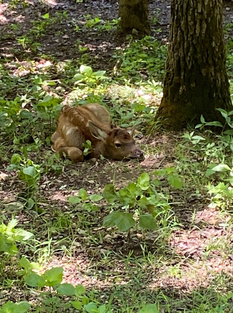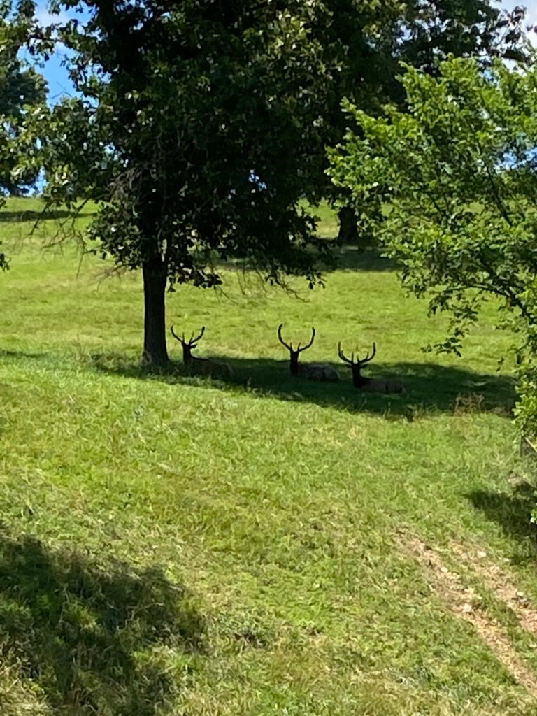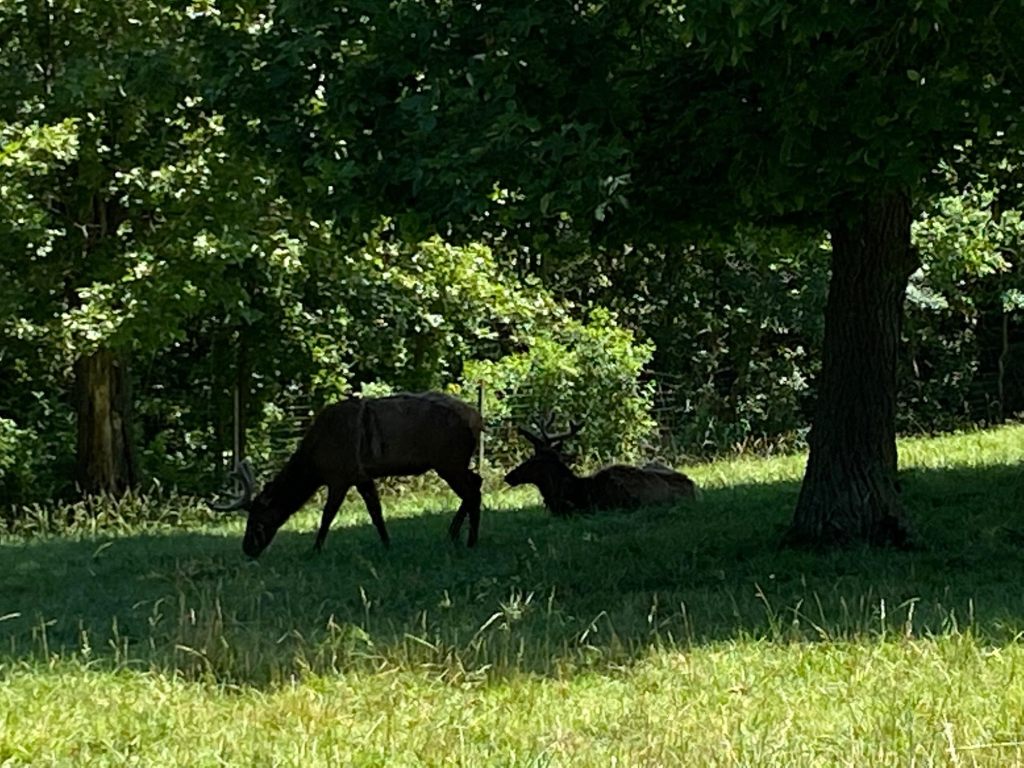 Elk – 1 week old, beautiful racks and does cooling in the shade on a hot day