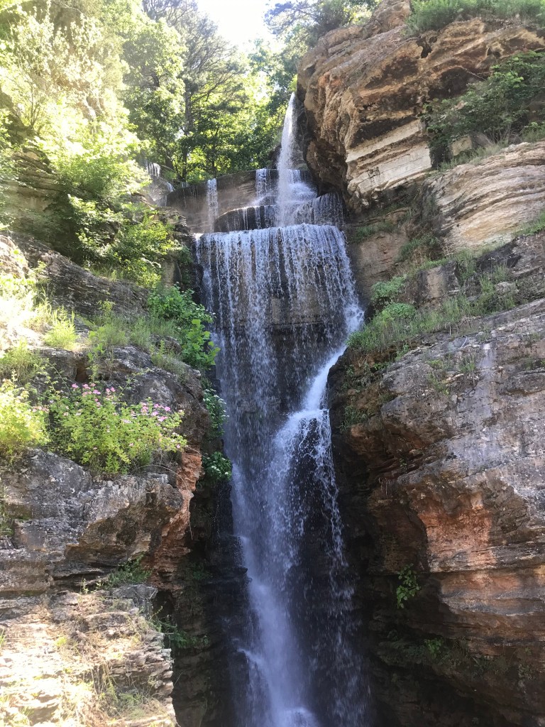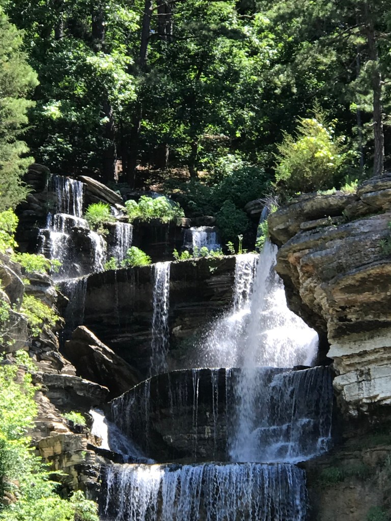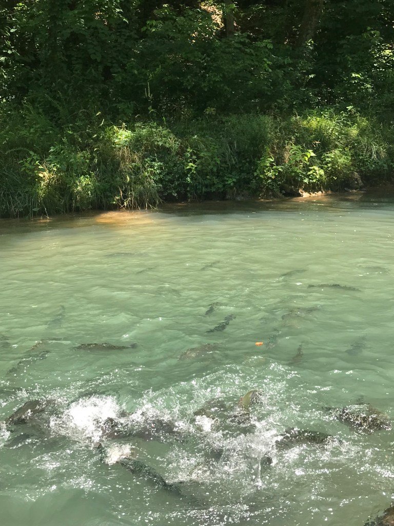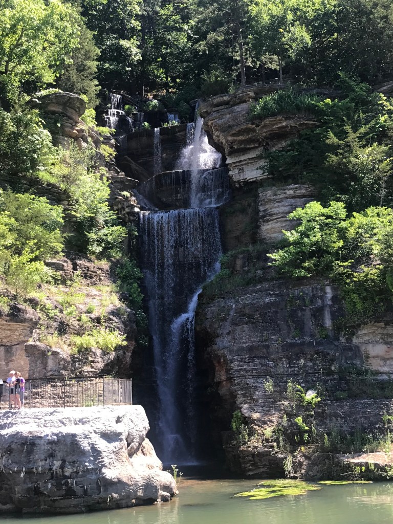 So, Tuesday morning, we set off to Dogwood Canyon, about 45 minutes southwest of Branson. On a hot day in southern Missouri, escaping to a 10,000 acre preserve of cool waters and luscious greenery was perfect. The preserve began with the purchase of 2,260 acres in 1990 by Johnny Morris, CEO of Bass Pro Shops. It was opened briefly to the public but was then closed for restoration and expansion. Over six years, construction of roads, bridges and infrastructure occurred that supports both the use and protection of what is now the home to long horn steer, elk and bison as well as bald and golden eagles and an amazing amount of rainbow trout.