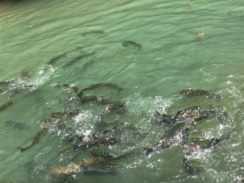 The waters appear totally calm except for the waterfalls – and the trout feeding!