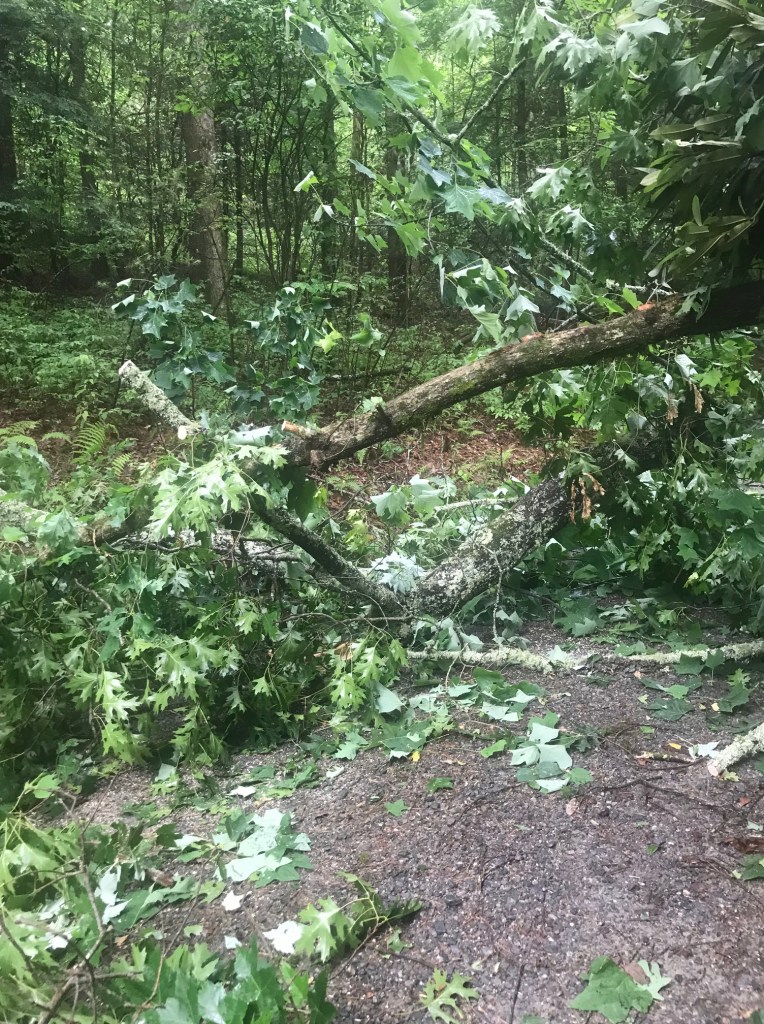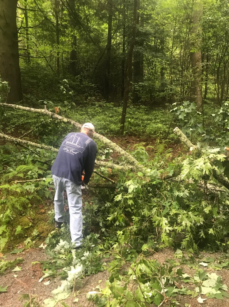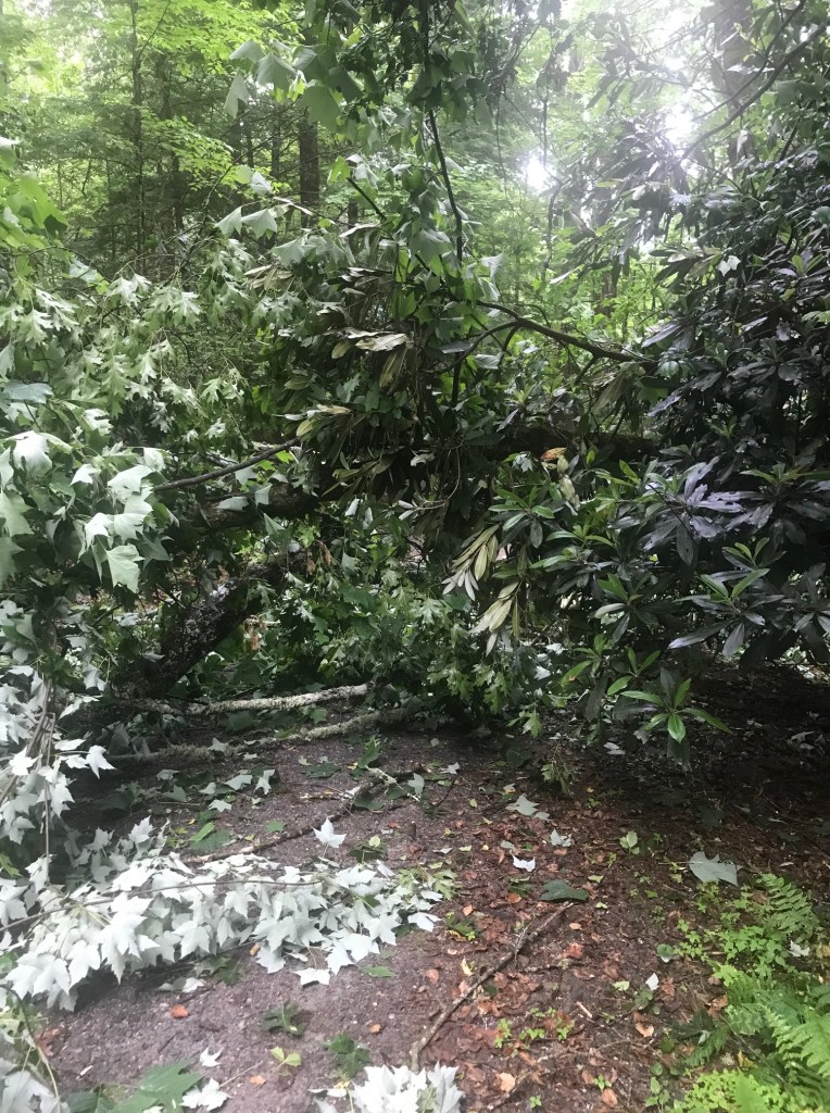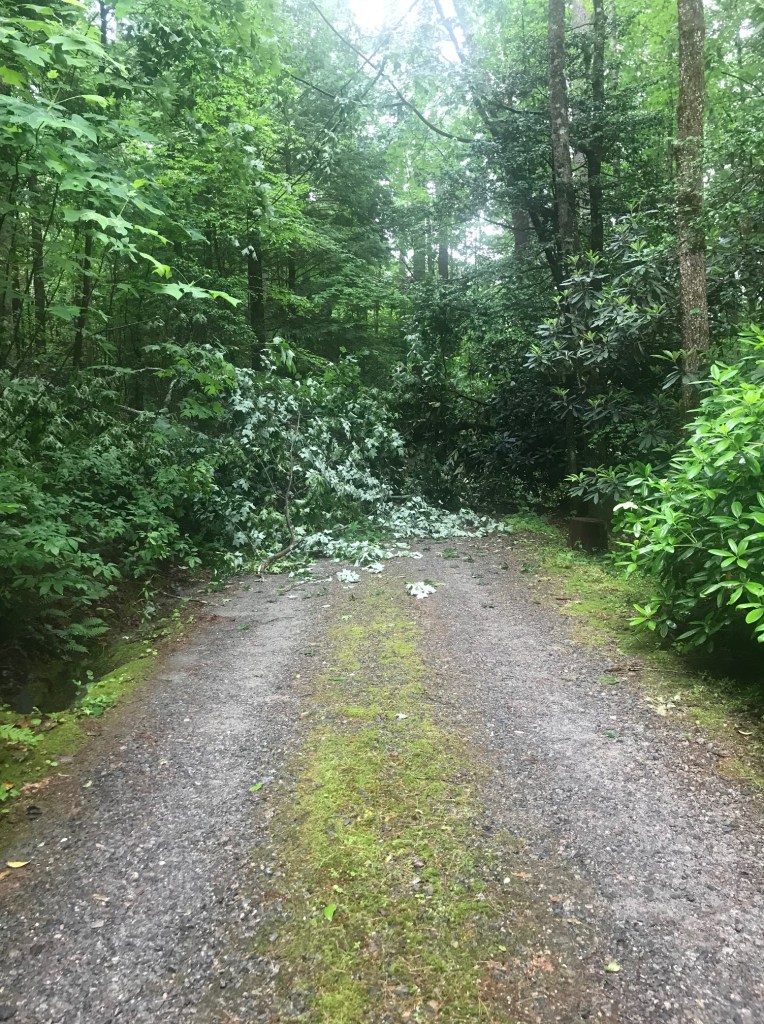 A storm the previous night evidently was all the old maple tree could handle. Unfortunately, as she came down, she took a tulip poplar and part of a rhododendron with it. So, back to the cabin for work clothes & gloves, loppers and chain saw. About an hour and a half later, we had the driveway cleared. Bill was able to cut the trunk of the maple such that we could roll pieces to the side of the drive – as there was no way we could pick them up! Thankfully, our reliable friend Kim Bishop & Crew will finish the job while we are gone. They have the equipment to handle it and we don’t have to face it when we return.
